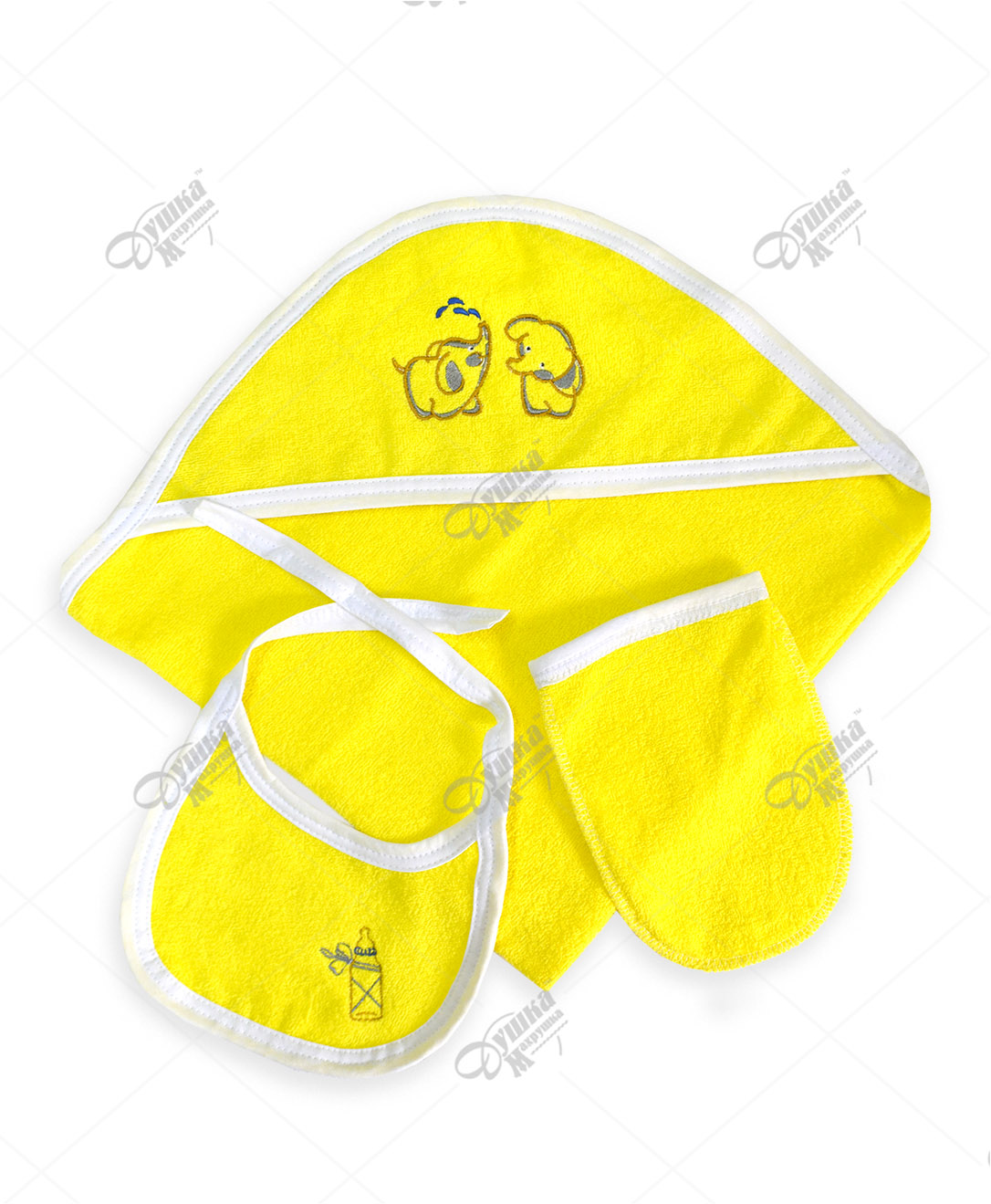 • Набор для купания желтый с вышивкой "Слонята" из 3 предметов. Прекрасный банный комплект с вышивкой создан из 100% натурального хлопка. Мягкая махра быстро впитает излишние капельки воды, оставшиеся после купания. В набор (комплект) входит: Полотенце с капюшоном размером 75х75 см; Слюнявчик - нагрудник на завязках; Рукавичка - мочалка. Теги: Для бани, Уголки детские махровые