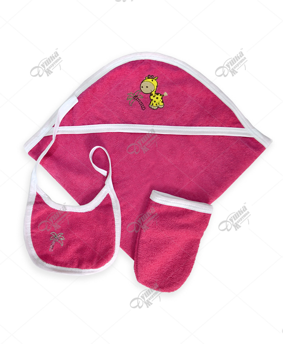Набор для купания малиновый с вышивкой "Жирафик" из 3 предметов. Прекрасный банный комплект с вышивкой создан из 100% натурального хлопка. Мягкая махра быстро впитает излишние капельки воды, оставшиеся после купания. В набор (комплект) входит: Полотенце с капюшоном размером 75х75 см; Слюнявчик - нагрудник на завязках; Рукавичка - мочалка. Теги: Для бани, Уголки детские махровые