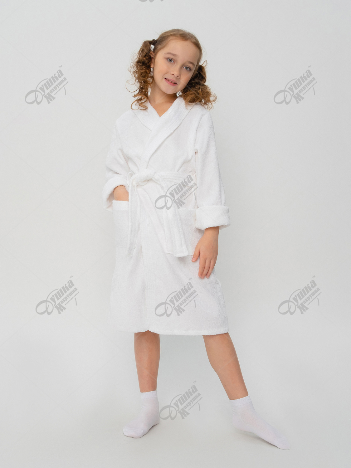 Халат махровый детский с капюшоном. Толщина халата позволяет носить его как летом, так и зимой в прохладном помещении, его удобно использовать и как полотенце, есть капюшон с ремешком из аналогичной ткани. Возможно нанесение вышивки любого цвета по желанию заказчика и выбор желаемого цвета халата. Машинная вышивка нитками долговечна и не теряет яркость после многочисленных стирок. Теги: Халаты, Махровые халаты, Детские