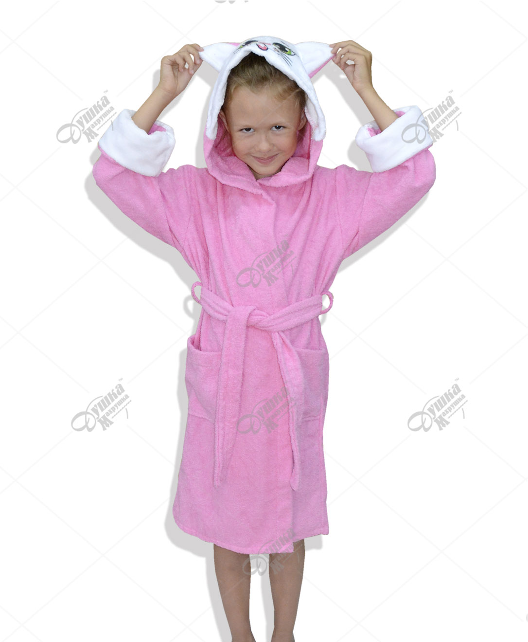 Удобный детский розовый махровый халат с капюшоном и ушками, широким поясом, глубокими карманами и печатным рисунком для девочки. Выполнен из высококачественного 100% хлопка. Печатный рисунок на капюшоне в виде мордочки кошечки. Рукава халата отделаны манжетам в тон капюшона. Изделие мягкое, легкое, но достаточно плотное, поэтому хорошо защищает ребенка от сквозняков. Гигроскопичная ткань отлично впитывает влагу, не раздражает нежную кожу и не линяет даже после многократных стирок в горячей воде. Наличие халатов по размерам и цветам уточняйте у менеджера при каждом заказе.