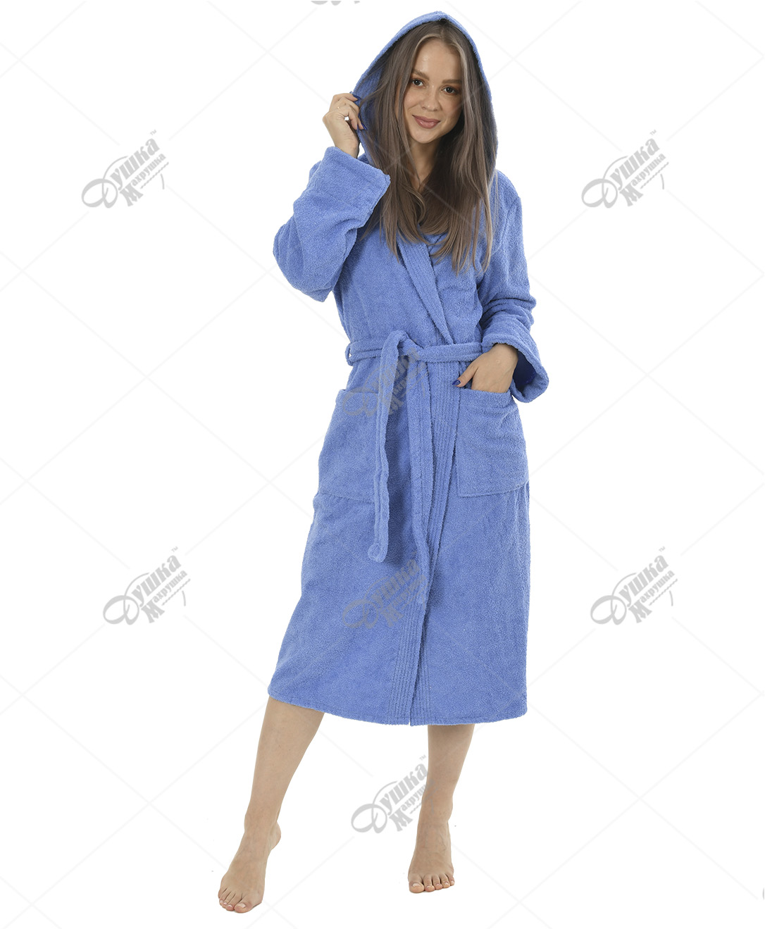 Халат женский голубой махровый удлиненный с капюшоном изготовлен из 100% хлопка, выращенного в экологически чистых регионах. Плотность – 400 г/м². Мягкая ткань приятна на ощупь, а широкий пояс позволяет плотно запахнуть халат, не причиняя коже дискомфорта. Изделие не линяет, не садится после стирки, прочное и износостойкое. Это оптимальный вариант комфортной и красивой одежды для бани, сауны, СПА-салона, дома (после приема душа).