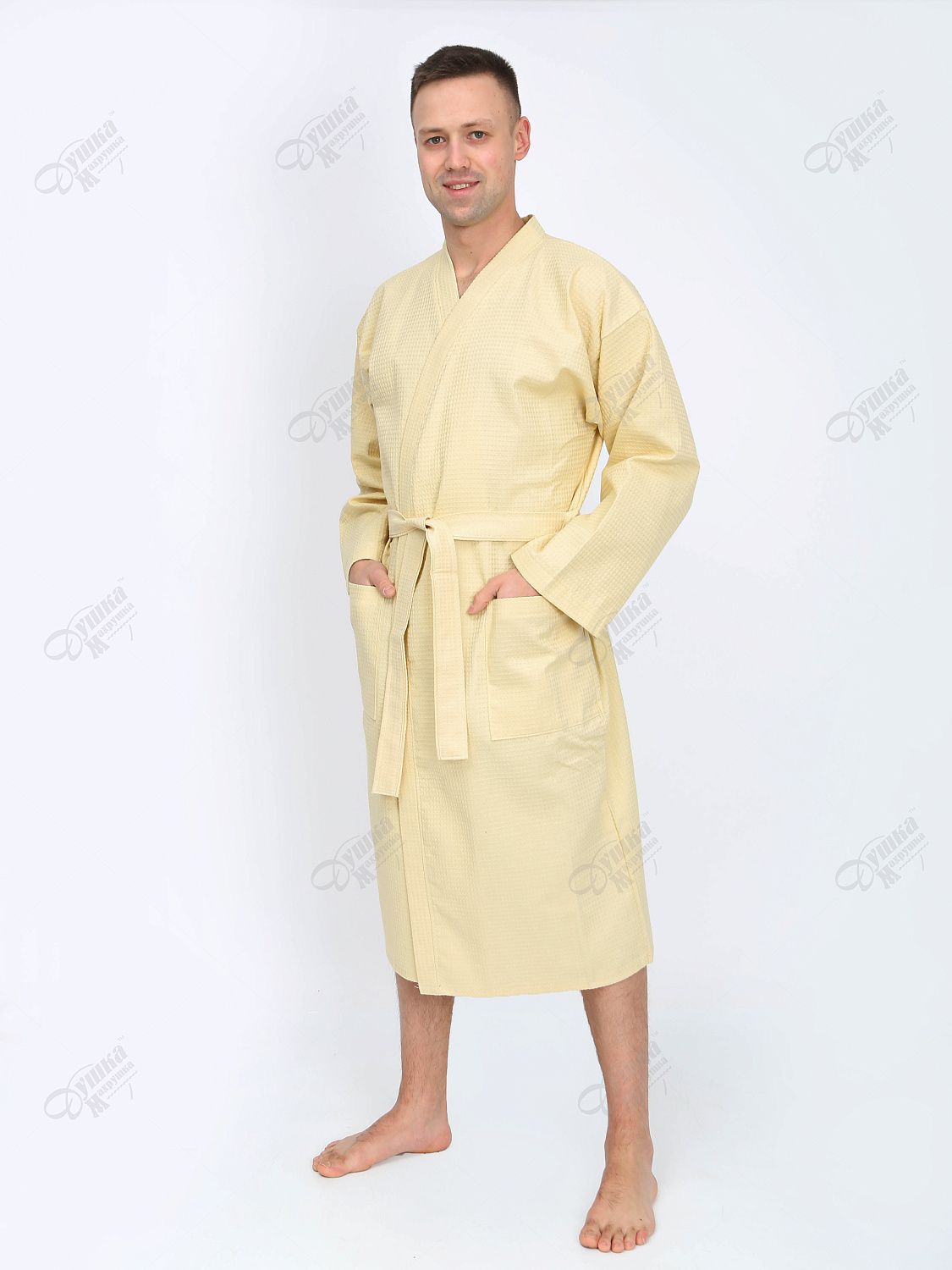 Вафельный кремовый мужской халат-кимоно из 100% хлопковой ткани выполнен в лаконичном восточном стиле. Изделие легкое, но достаточно плотное (240 г/м²). Строгий дизайн удачно сочетается с рифленой фактурой ткани, благодаря чему халат приобретает характерный вид повседневного мужского кимоно периода Эдо. Модель практична, не линяет даже после многочисленных стирок. Отлично подойдет для бани, сауны или как домашний вариант повседневной одежды. Наличие по размерам и цветам уточняйте у менеджера при каждом заказе. Теги: Халаты, Вафельные халаты, Мужские