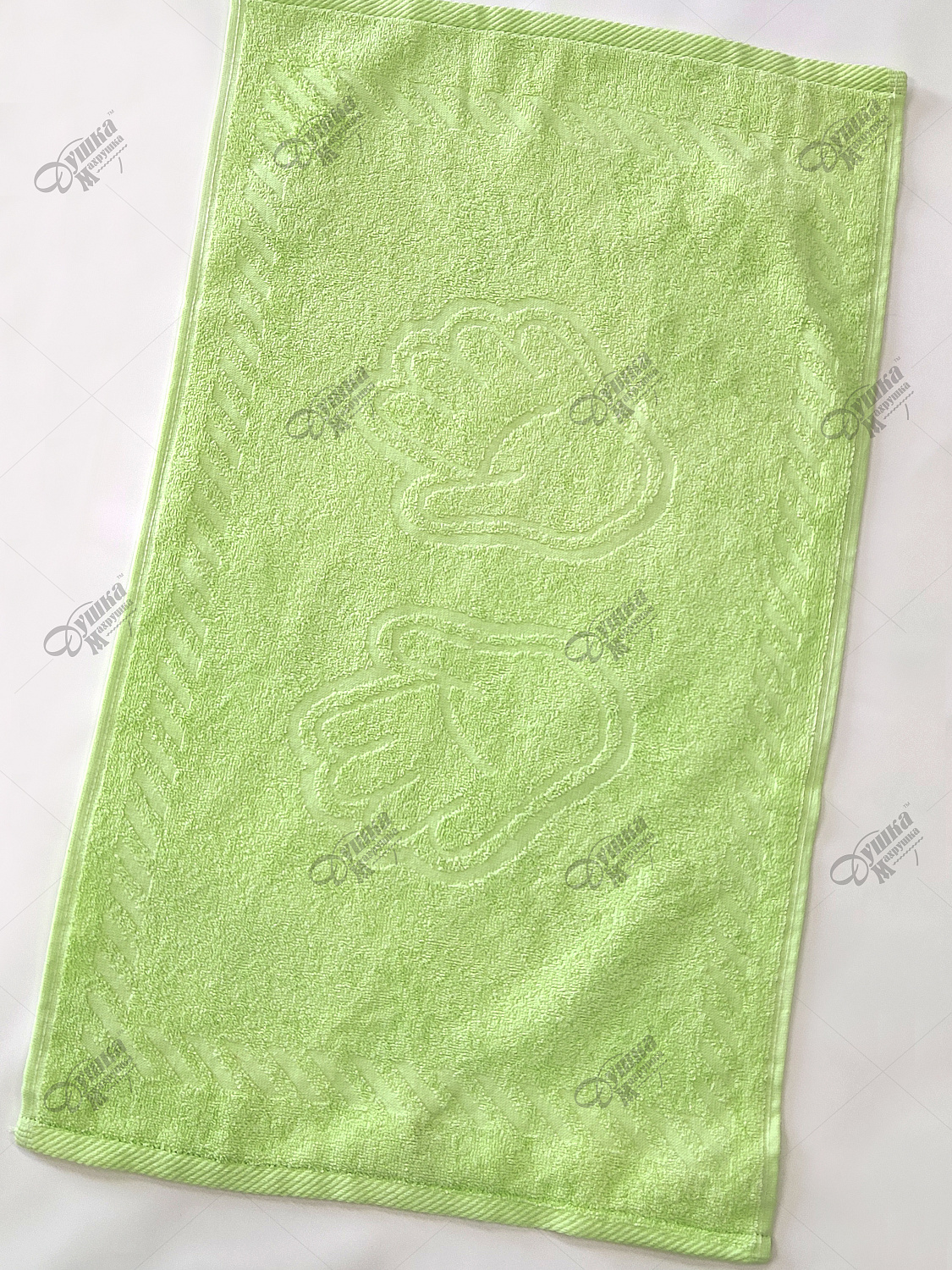 Симпатичное салатовое махровое полотенце из серии «ножки и ручки» выполнено из мягкой хлопковой нити отличного качества. Изделие украшено рельефным рисунком и орнаментом, смотрится стильно и дорого.