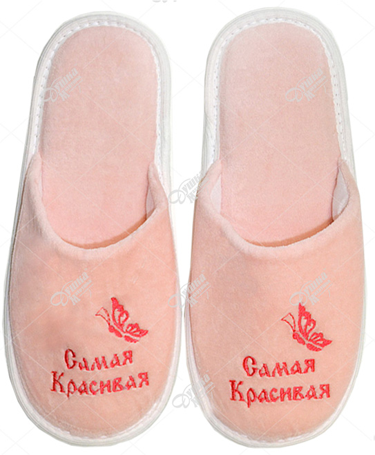 Тапочки с вышивкой "Самая красивая". Ткань верха и следа - махровая ткань. Подошва ЭВА толщиной 4,5 мм. Обращаем внимание, что на данную категорию выпускаемой продукции даем гарантию только на изделие и вышивку. Цвета самих тапок и ниток могут меняться, идут в ассортименте. Теги: Тапочки, Женские